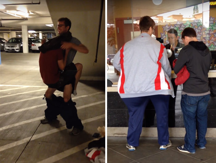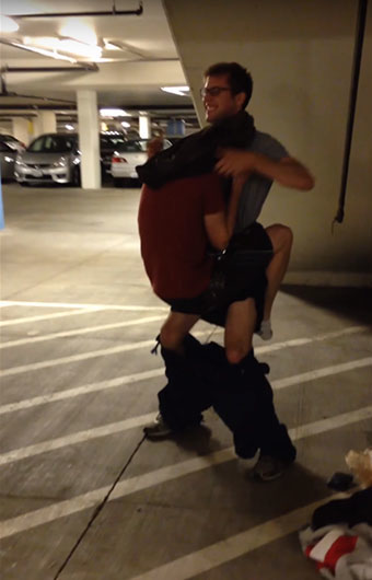 Budete potřebovat: 1x mega velkou bundu, 1x XXXL kalhoty a pořádnou dávku kuráže. Postup je následující: Chytněte do náruče kamaráda a přisajte se k němu jako klíště. Poté se navlečte do připraveného oblečení a můžete vyrazit.