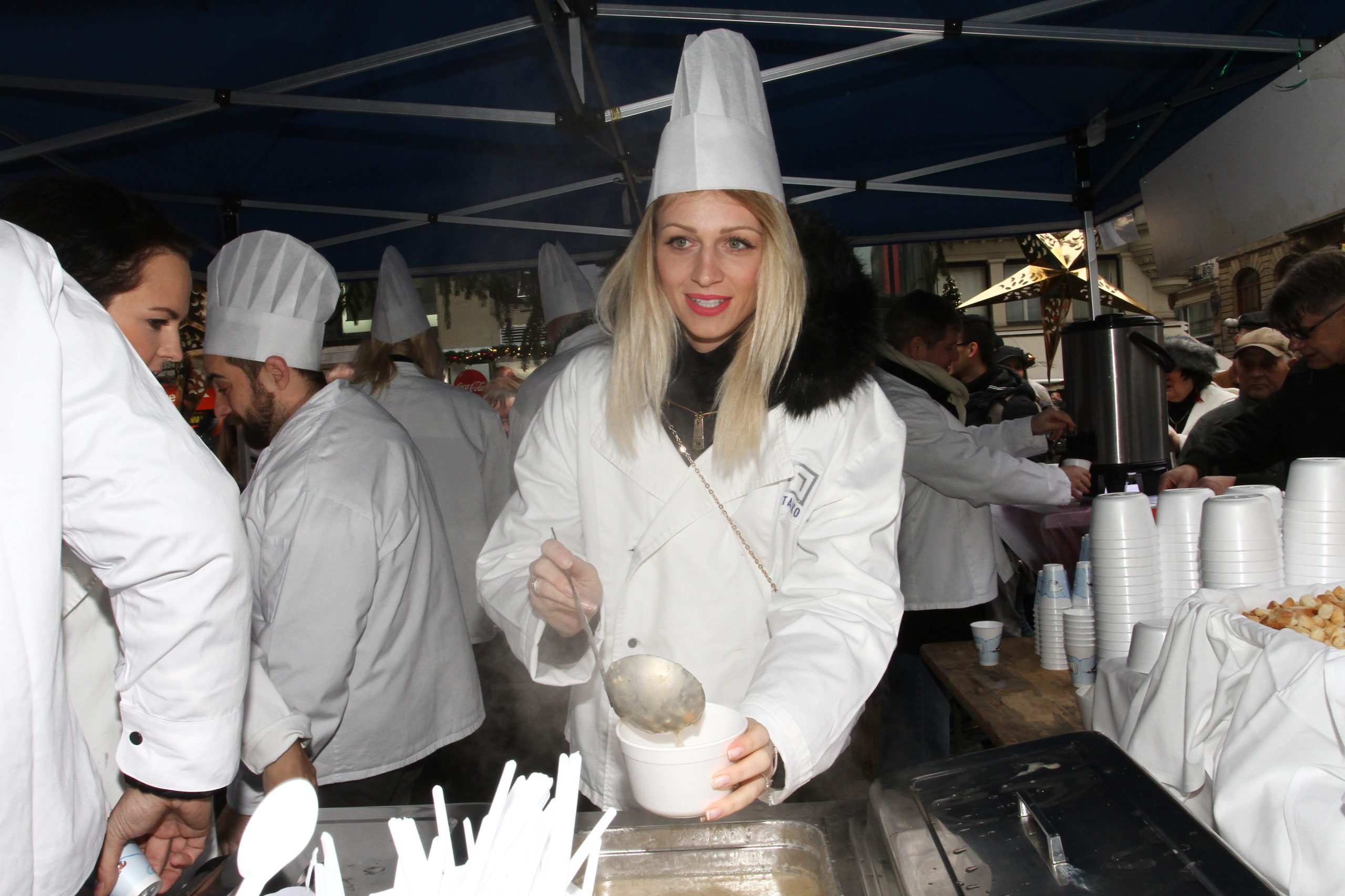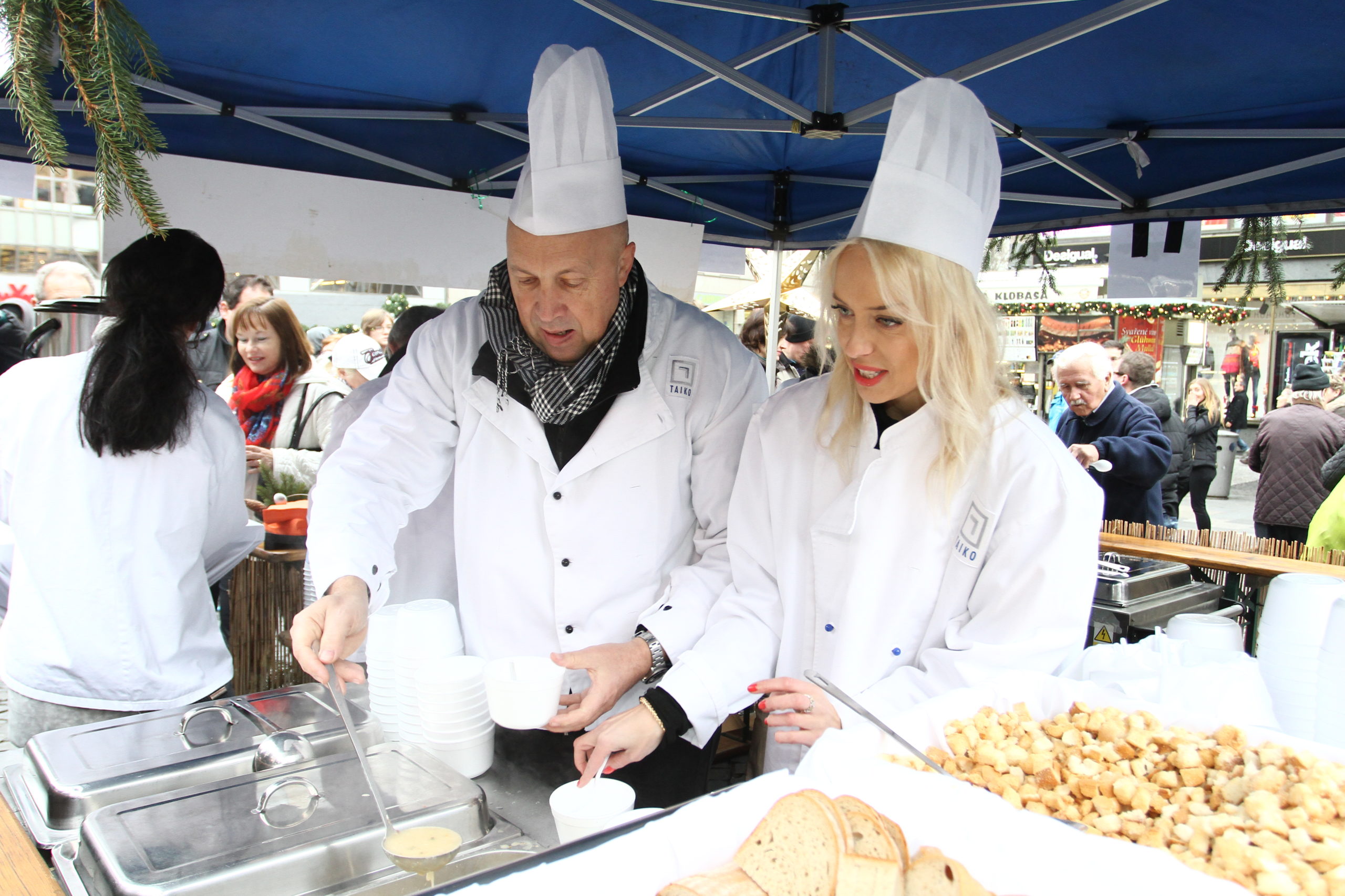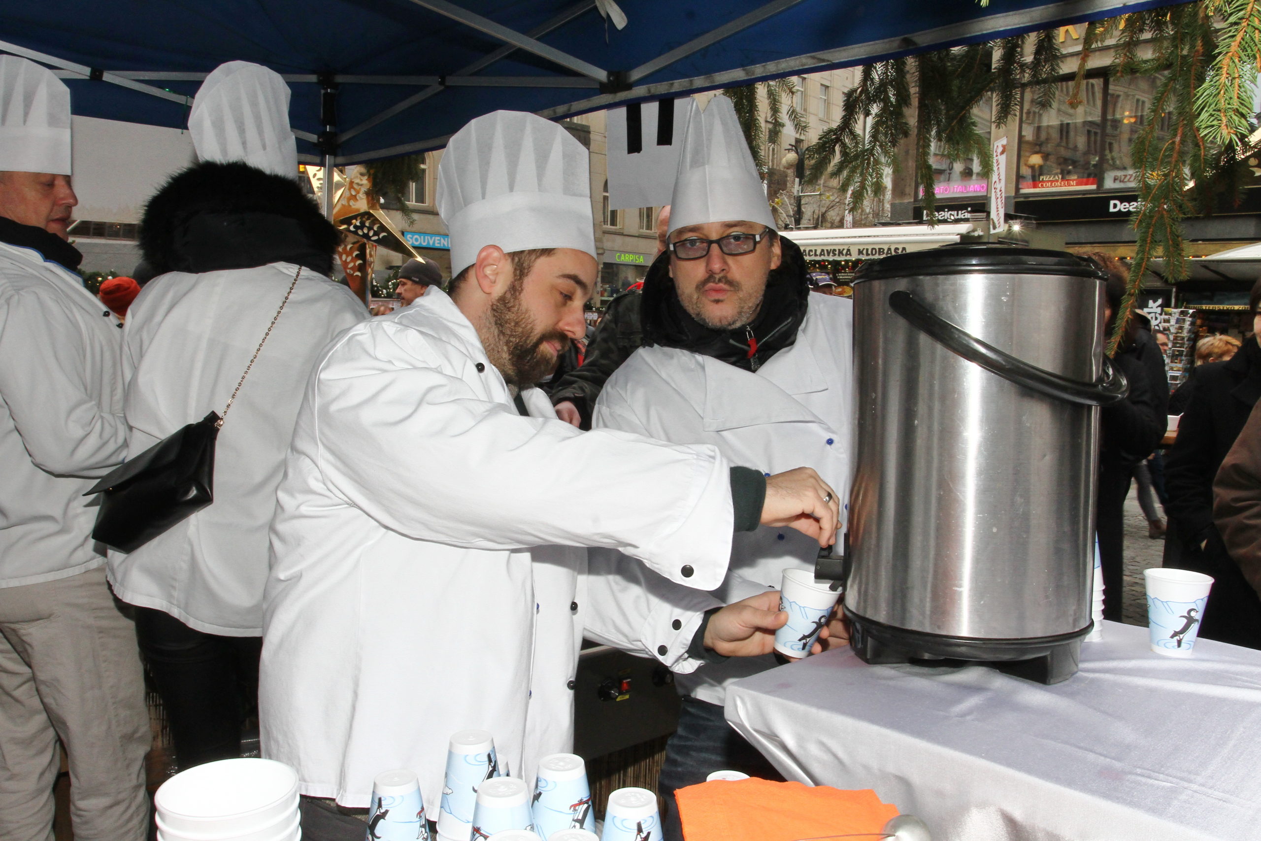 Včera vyrazili pomáhat například zpěváci MARIAN VOJTKO (42) a PETR KUTHEIL (34) a modelka VERONIKA KAŠÁKOVÁ (25) se zpěvačkou KATEŘINOU MÁTLOVOU (36). Oblékli se do kuchařských mundúrů a nálevali rybí polévku těm, na které se neusmálo tolik štěstí, jako právě na ně. Záslužná činnost. Jen škoda, že jich není více…