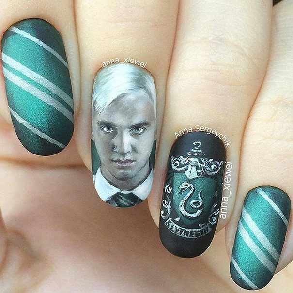 Je to práce nehtových umělkyní, které se nechaly inspirovat motivy z Harryho Pottera. Takže – abrakadabra, simsalabim a máte celé kouzelné ruce. S takovým dizajnem to každopáně chce na tři týdny zapomenout na všechny ruční práce, mytí nádobí a raději vynechat i PC klávesnici. Zničit si takové skvosty – prokřičíte celou noc!